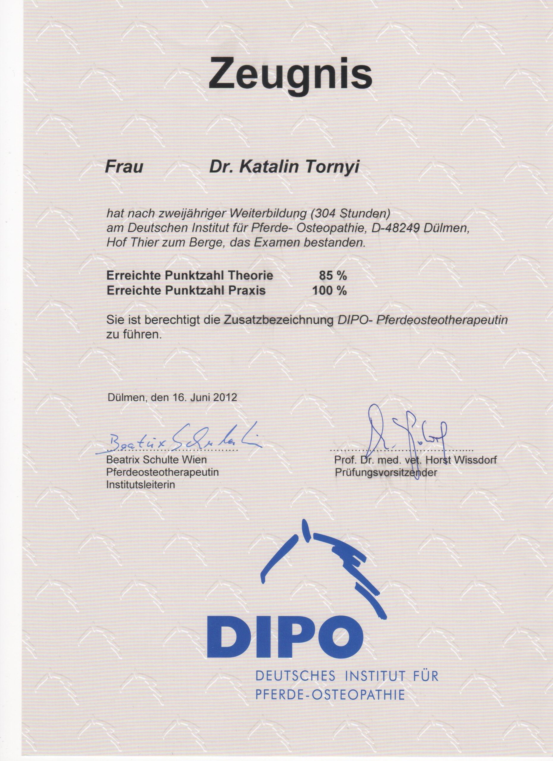 Iskolai tanulmányaim során érdeklődési körömnek megfelelő szakkörökre és különórákra jártam. Egyetemi éveim alatt pedig már szívesen látogattam különböző szakmai rendezvényeket és továbbképzéseket. Ahogy kiköltöztem Németországba, az ország méretéből adódóan is egy új világ nyílt meg előttem ezen a téren is. Már az első kinti hónapok során beiratkoztam a DIPO (Deutsche Institut für Pferdeosteopathie) következő ló osteo- és fizioterapeuta képzésére. S ezzel egy igazi tanulási és fejlődési cunamit indítottam el az életemben. Volt olyan időszak, amikor a főállású állatorvosi munkám mellett 2 különböző szakmai képzésre is jártam. Hogyan tudtam ezt akkor sikeresen abszolválni? Ezen manapság én is el szoktam gondolkodni! De úgy vélem, a céltudatosság, az elhivatottság és a kitartás csodákra képesek!